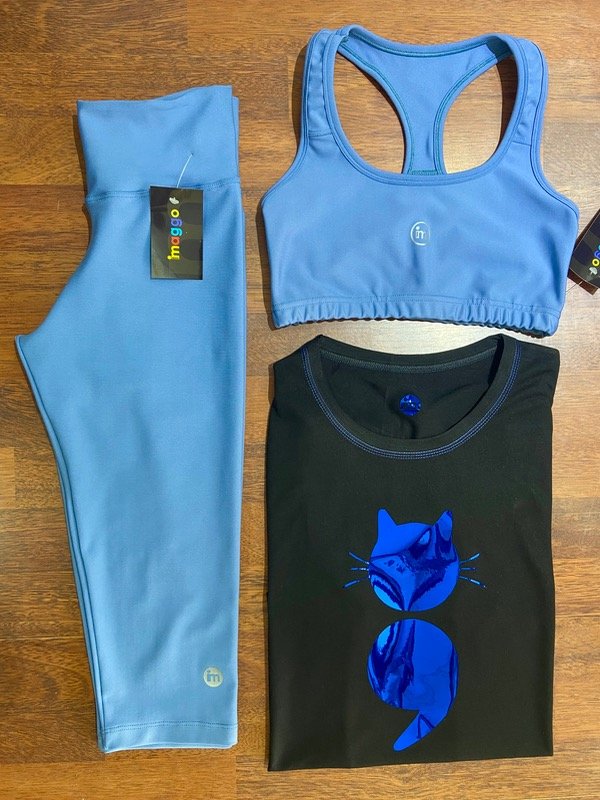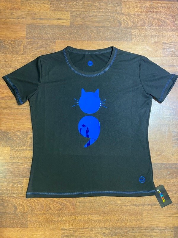 Remera con mangas cortas en algodón con bordadores azules y estampa en azul metalizado